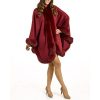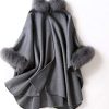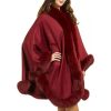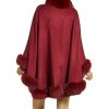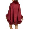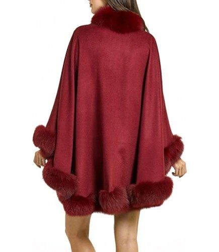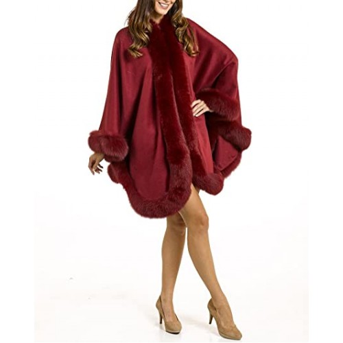 This theatrical design is dramatic with a 100% cashmere body. A vivid trim of genuine fox fur provides a lush and elegant look for the fall or winter. The ranch raised fox fur is sublimely lush and soft atop the trim for a subtle contrasting look. A single hook and eye closure fastens this cape over your ensemble. A concealed under arm snap closure creates a relaxed and natural appeal with its Batwing Sleeve design. A loop on the back lets you hang this cape with ease for safekeeping. The Classic Cashmere Cape with Fox Fur Trim in Burgundy can be worn over a sleek dress or a casual outfit. This large one size fits all design would look perfect during a day exploring the wonders of nature.
