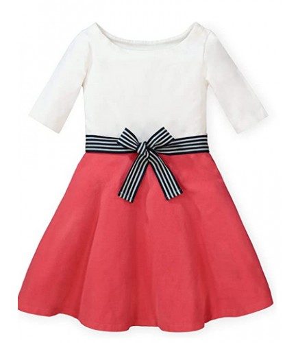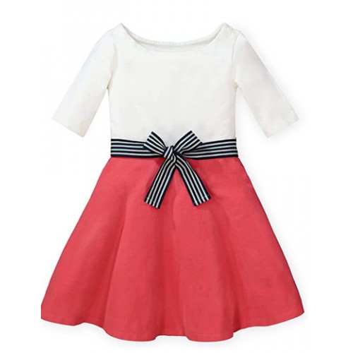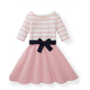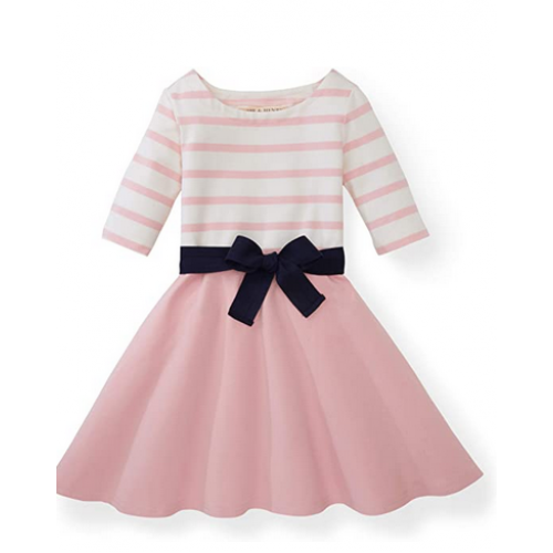 The perfect dress for any occasion! Our French-inspired skater dress is cut in super soft cotton/spandex jersey in an easy pull-on classic style with striped top and solid knit skirt. Features a grosgrain ribbon sash and bow at the center waist for that extra feminine touch.