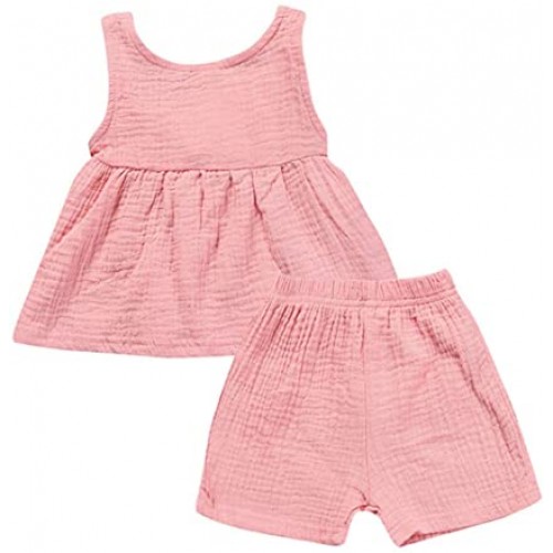 Elasticity round collar, solid color ruffle top, short sleeve, elastic waist short. Simple design and match make your little one feel more comfortable and cool. Ruffle design more sweet and fashion!