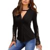Women Sexy Long Sleeve V Neck Tops Slimming Lace Design Blouses Cross Front Solid Tunic Tops Cut Out T Shirts