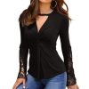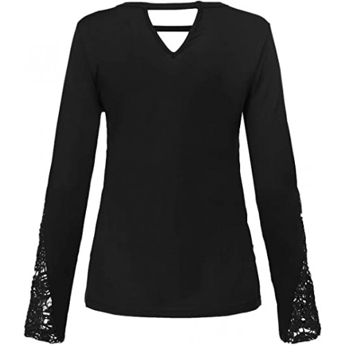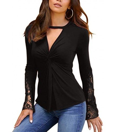- women sexy long sleeve v neck tops slimming lace design tee blouses bodycon blouse twist knot front tops is sexy, elegant, chic, charming and fashion. Features: Deep v neck slim fit t shirt clubwear, plain long sleeves tops with lace hollow out design t shirt, cut out, tight waist pullover, backless bodycon fit choker neck t-shirts for women, ladies, young girls.