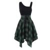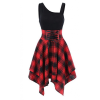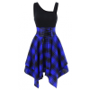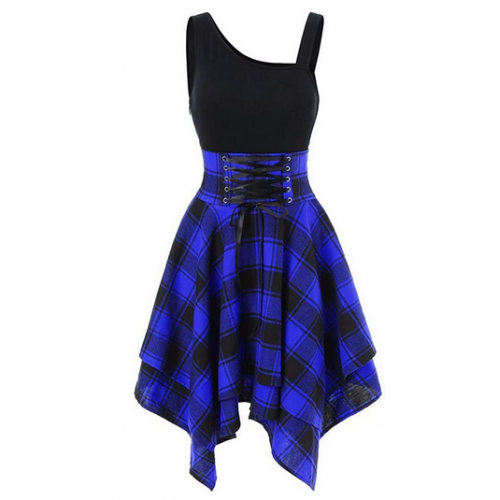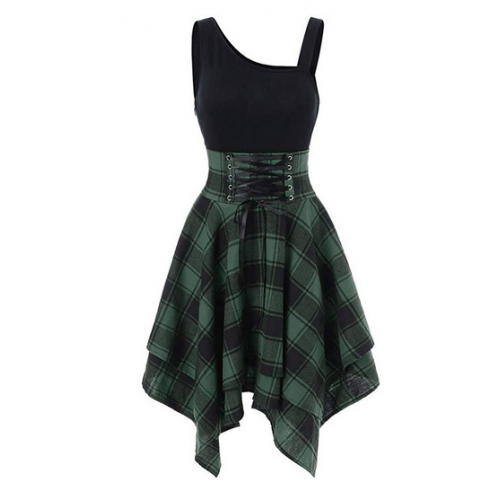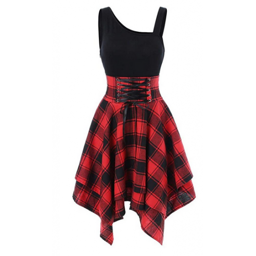 Women Sleeveless Skirt Cold Shoulder Cross Lace Up Plaid Print Irregular Dress