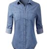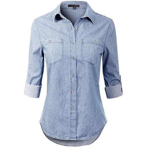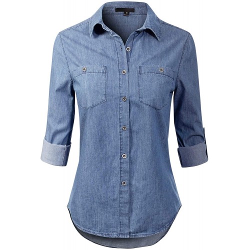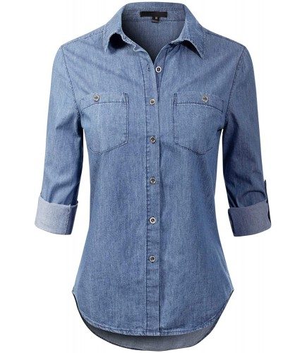 Women’s Basic Classic Roll up Sleeve Button Down Chambray Denim Shirt