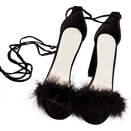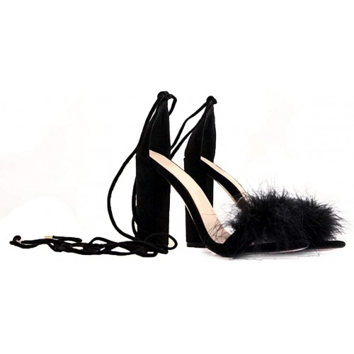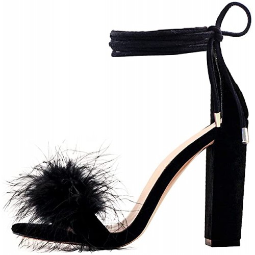 Women’s Fashion Feather Sandals Open Toe Cross Band Chunky Heels Lace-Up High Heel Wedding Sandals