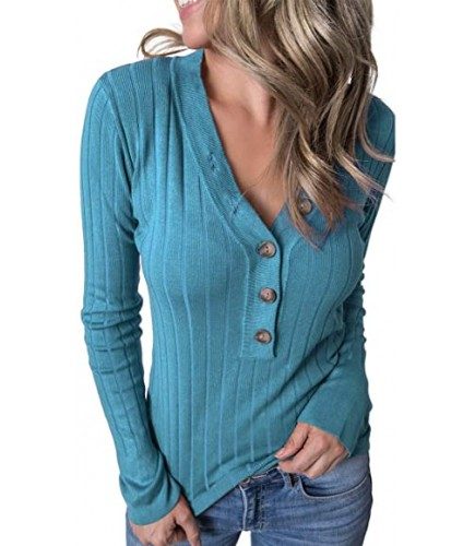 Women’s Long Sleeve V Neck Ribbed Button Knit Sweater Solid Color Tops