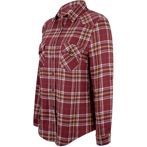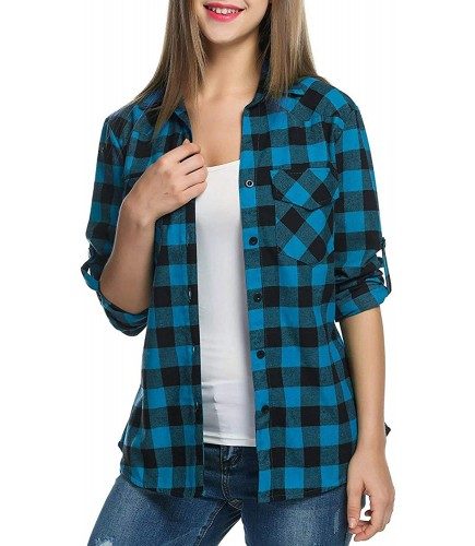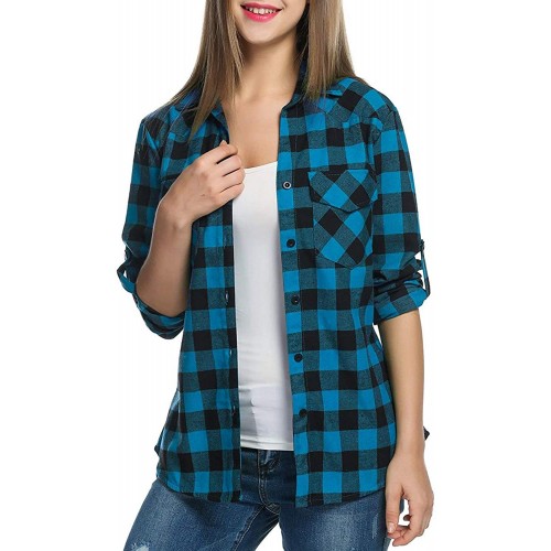 Feature: Turn-Down collar, Plaid pattern, Roll up long sleeve, Button down shirt, Two chest pockets, Casual loose fit, Boyfriend style, Buffalo Check Gingham Top, Flannel Long Sleeve with Buttons, Long Tops Shirts Blouses, Classic plaid shirt with collar